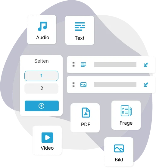 Erstellen und verwalten Sie Schulungen effizient und intuitiv. Mit wenigen Klicks gestalten Sie ansprechende Kurse mit multimedialen Inhalten wie PDFs, Bildern, Videos, Texten und Audios. Verschiedene Fragetypen (Single Choice, Multiple Choice, Zuordnungsaufgaben) helfen, das VerstĂ€ndnis zu ĂŒberprĂŒfen.